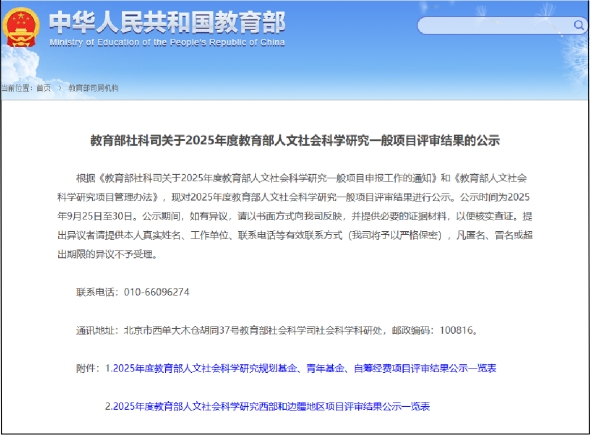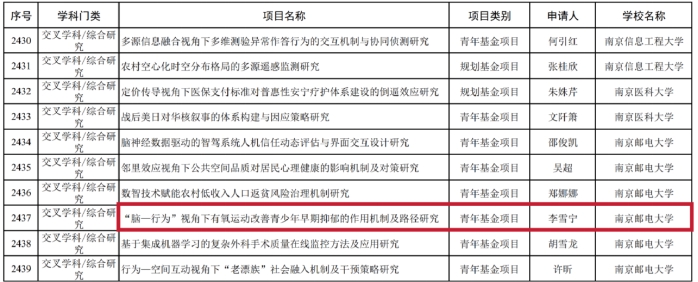 9月25日,教育部社科司对2025年度人文社会科学研究一般项目评审结果进行公示,体育部李雪宁老师申报的课题《“脑—行为”视角下有氧运动改善青少年早期抑郁的作用机制及路径研究》成功获得青年基金项目立项。
