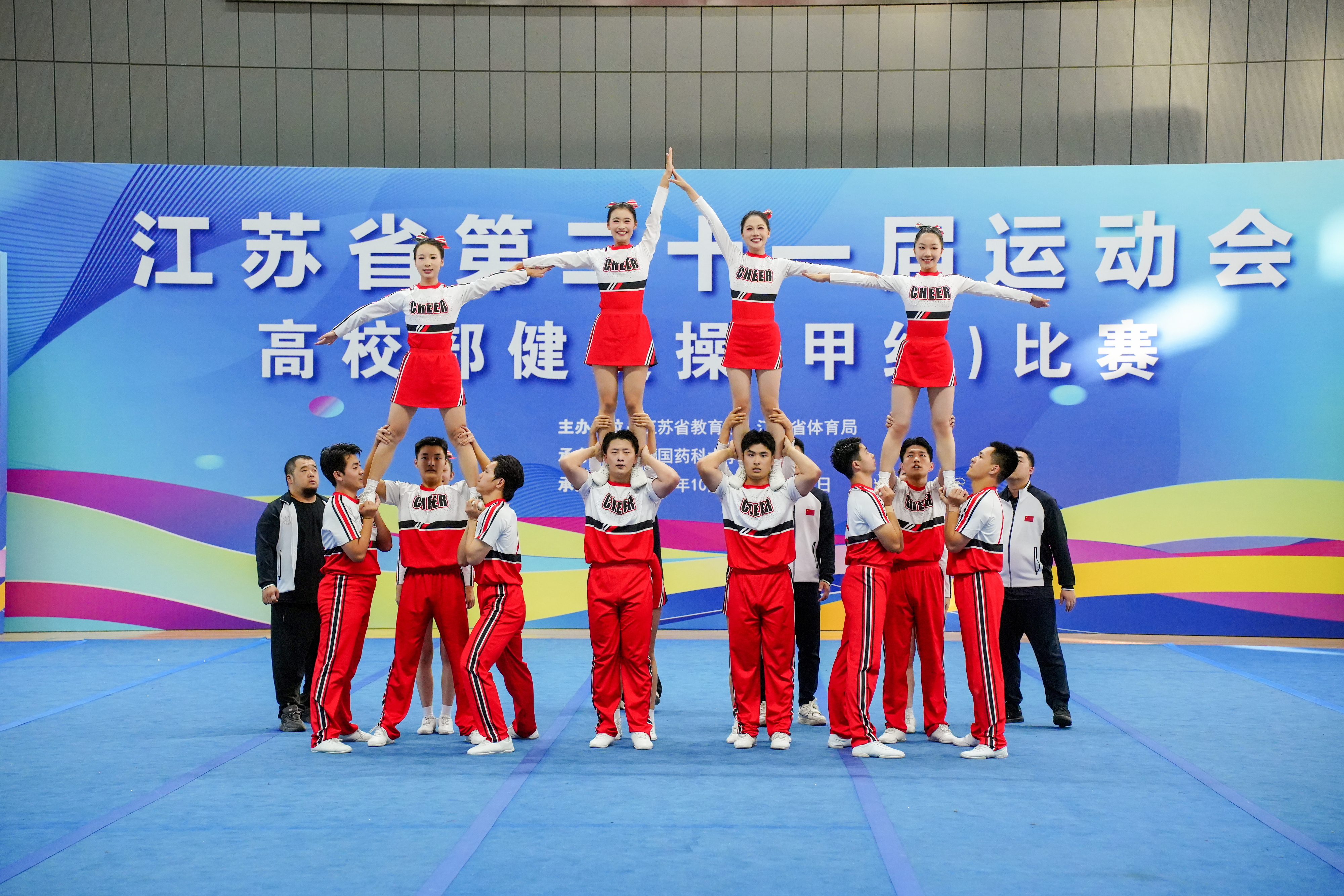 10月30日至11月2日,江苏省第二十一届运动会高校部健美操比赛(甲组)在中国药科大学江宁校区体育馆顺利举行。本次比赛汇聚了来自省内21所高校(甲B组)的293名运动健儿,同场竞技,尽显风采。南京邮电大学啦啦操队共派出21名队员参赛,在多个比赛项目中表现优异,屡获殊荣,以出色的竞技水平和昂扬的精神面貌赢得了广泛赞誉。
