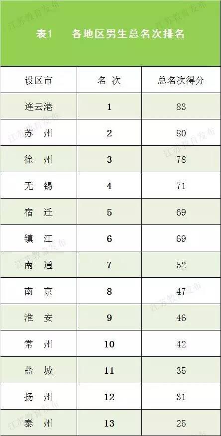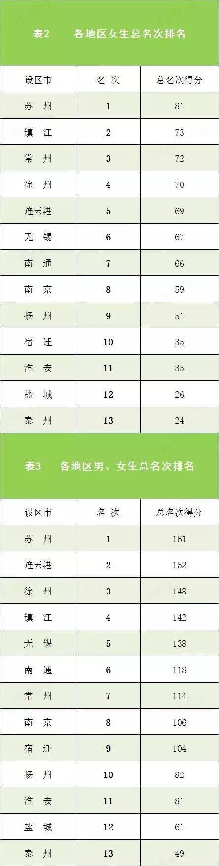 2016年江苏省男生合格率前3名的是无锡、连云港和宿迁,女生合格率前3位的是苏州、无锡和徐州;男生优良率排前3位的是苏州、宿迁和连云港,女生优良率前3位的是常州、苏州和镇江;总名次前3位的分别是苏州、连云港和徐州。