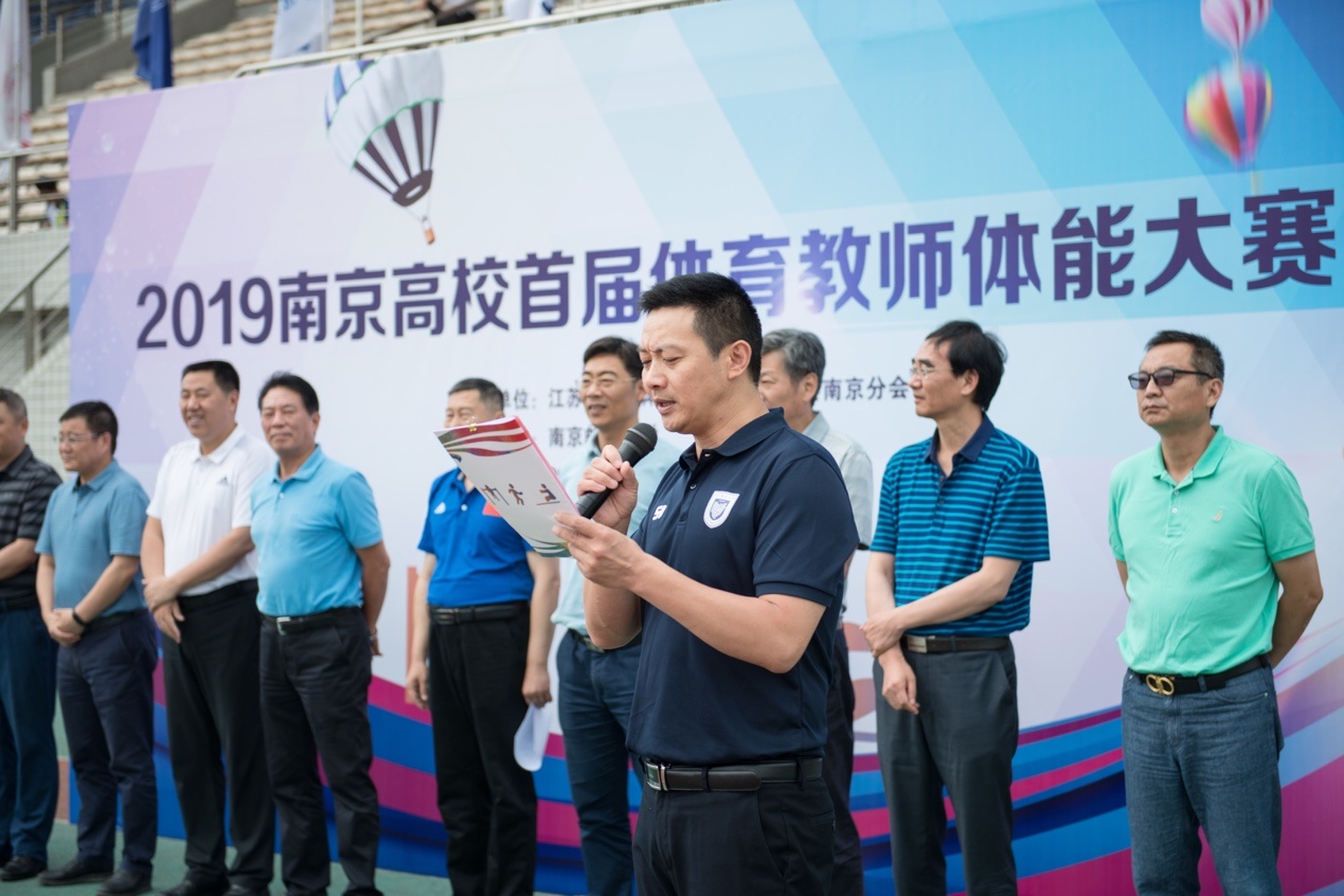 江苏省学生体协高校工作委员会南京分会主任殷飞教授致开幕词,他指出举办高校体育教师体能大赛是为了进一步贯彻落实好习近平总书记在全国教育大会上的重要讲话精神,激励广大体育教师不忘初心,牢记使命,通过身体力行,言传身教,提升高校体育育人工作水平。他强调本次大赛系首次举办,开创了高校体育教师体能大赛的先河,是对南京高校体育教师体质体能的一次大检阅,对于推动高校校园体育运动,繁荣校园体育文化,增强师生体质具有十分重要的意义。