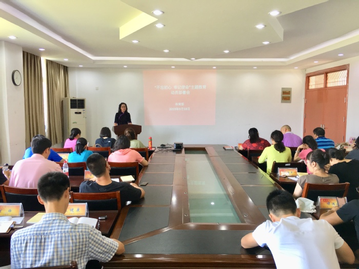 9月18日中午,体育部党总支在体育馆202会议室召开“不忘初心、牢记使命”主题教育动员部署会,体育部全体党员参加会议,党总支书记杨玲主持会议。