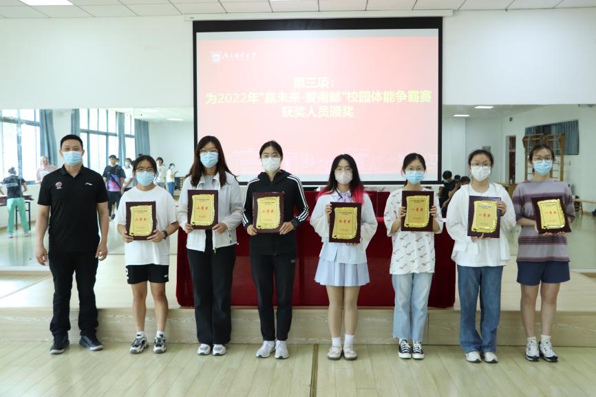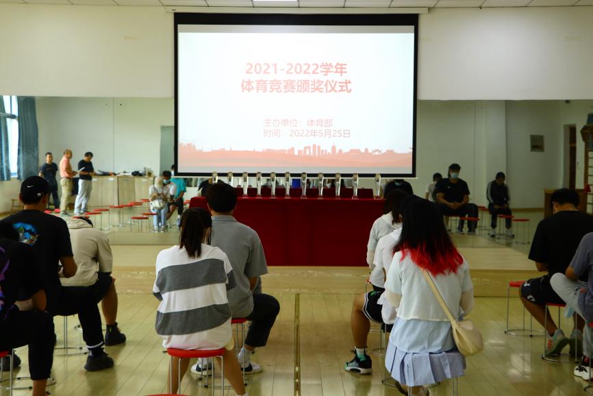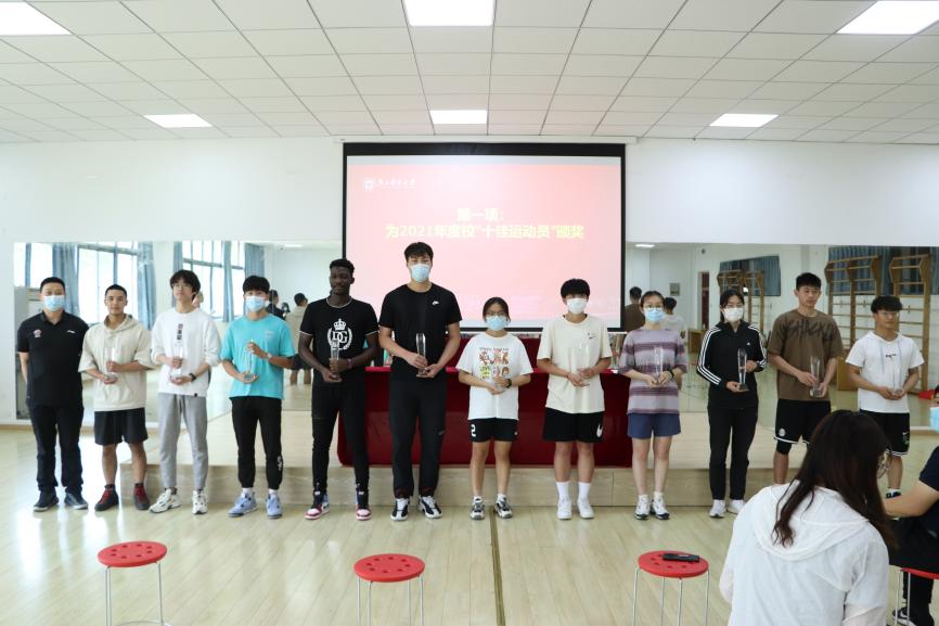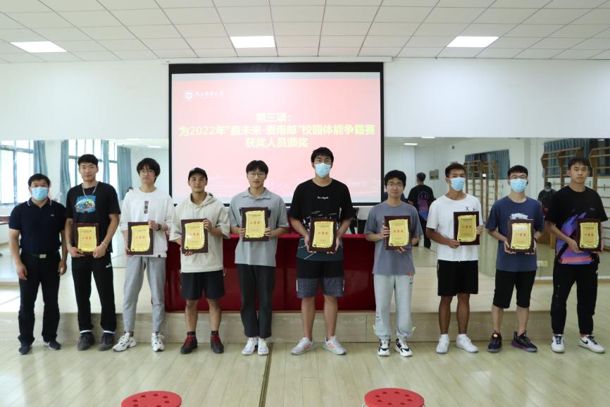 5月25日,2021-2022学年体育竞赛颁奖仪式在体育馆一楼一号教室举行。获奖同学代表按照学校防疫要求佩戴口罩参加现场颁奖,秩序井然。体育部领导分别为“2021年度校十佳运动员”、“2021年度校优秀体育干部”、“2022年‘赢未来·爱南邮’校园体能争霸赛”获奖代表颁奖。
