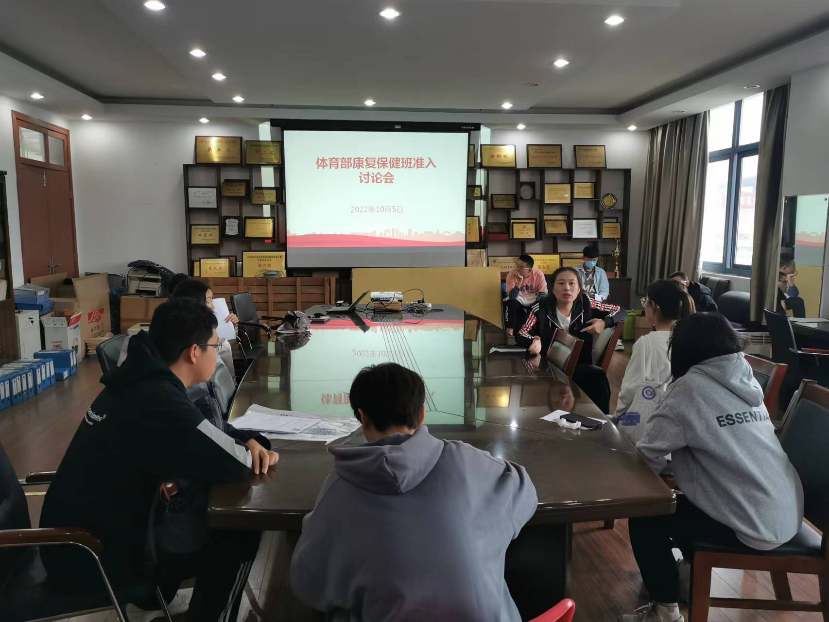 10月5日中午12:30,体育部在仙林体育馆203会议室召开学生康复保健班准入机制讨论会。部门康复保健课程负责人、教学秘书、相关任课教师和学生参加了会议。会议由体育部康复保健课程负责人谈艳主持。