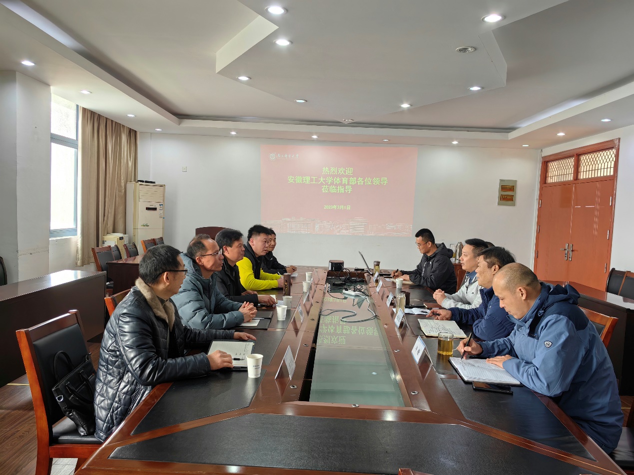 3月1日下午,安徽理工大学体育部主任邹瑞一行5人来我校进行调研交流。座谈会由体育部主任朱建勇主持,党总支书记陈友民、副主任邱锴和王东海参加座谈会。