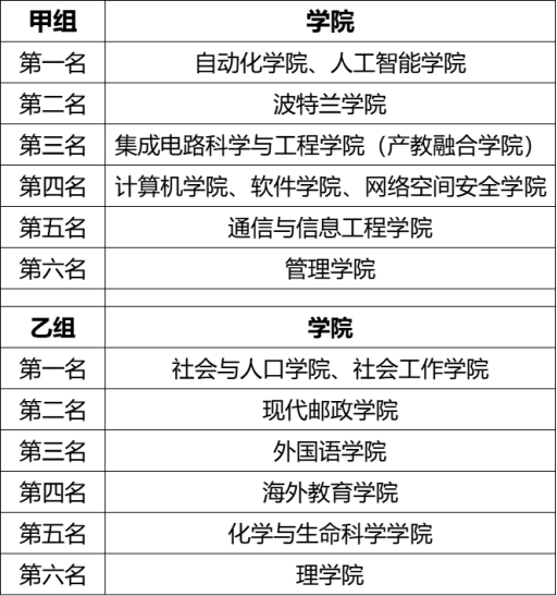 经过多轮激烈的角逐,自动化学院、人工智能学院获得了甲组第一名,波特兰学院、集成电路科学与工程学院(产教融合学院)分列甲组二、三名;社会与人口学院、社会工作学院荣获乙组冠军,现代邮政学院、外国语学院获得乙组亚军和季军。